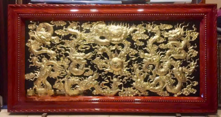 Cửu Long chầu nguyệt- Tranh đồng tấm liền khung gỗ -A173