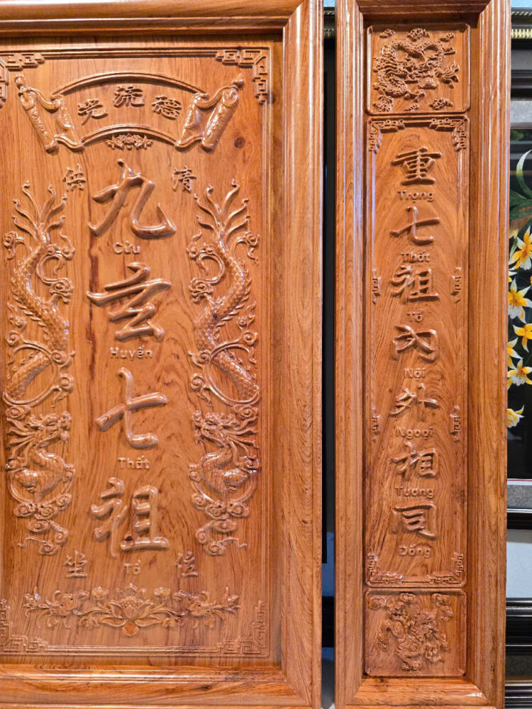Liễn thờ gia tiên- Cửu Huyền Thất Tổ, chữ Hán bằng gỗ hương