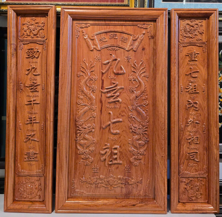 Liễn thờ gia tiên- Cửu Huyền Thất Tổ, chữ Hán bằng gỗ hương