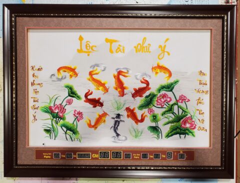 lịch vạn niên tranh thêu- Vạn sự hanh thông – Cửu ngư quần tụ, đèn led- DH2017