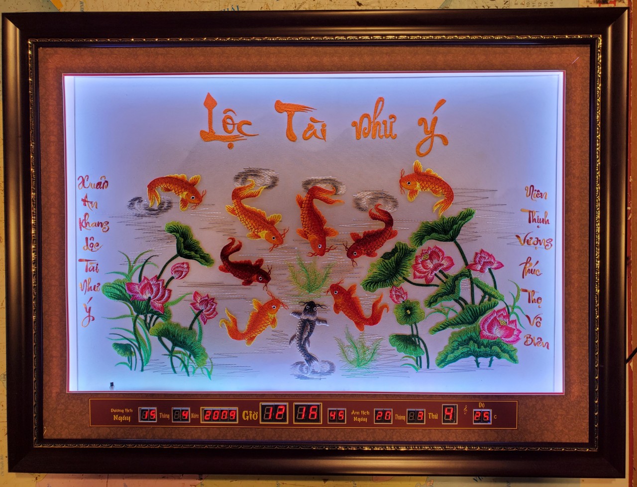 | Tên sản phẩm: | lịch vạn niên tranh thêu- Vạn sự hanh thông – Cửu ngư quần tụ, đèn led- DH2017 |