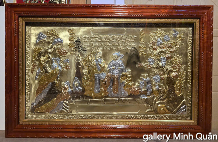 Tranh được chế tác bằng đồng vàng nguyên chất liền tấm ,thúc gò thủ công mạ vàng , bạc.