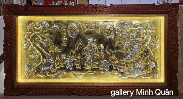 Tranh được chế tác bằng đồng vàng nguyên chất liền tấm ,thúc gò thủ công mạ vàng , bạc.