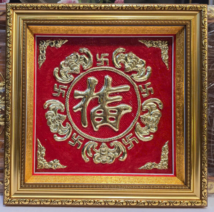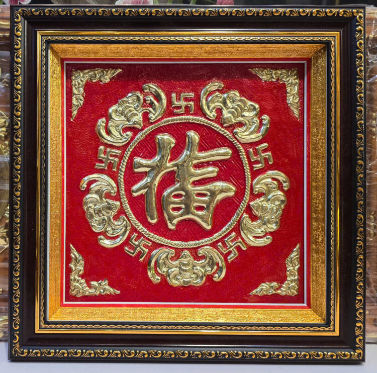 Bức tranh chữ Phúc này là tác phẩm nghệ thuật phong thủy rất phổ biến trong văn hóa Á Đông, đặc biệt là tại Việt Nam. Đây là bức tranh chữ Phúc (福) được thúc nổi bằng đồng trên nền đỏ, mang nhiều tầng ý nghĩa tốt lành. Dưới đây là chi tiết ý nghĩa của bức tranh này: 1. Ý nghĩa trung tâm: Chữ Phúc (福) Chữ Phúc biểu thị cho sự may mắn, sung túc và hạnh phúc. Trong quan niệm dân gian, “Phúc” đứng đầu trong bộ ba Tam Đa (Phúc – Lộc – Thọ). Việc treo chữ Phúc trong nhà thể hiện mong ước về một cuộc sống bình an, gia đình hòa thuận và mọi sự hanh thông. 2. Biểu tượng Ngũ Phúc Lâm Môn Xung quanh chữ Phúc lớn là hình ảnh 5 con dơi (trong tiếng Hán, con dơi là “Bức”, đồng âm với “Phúc”). * Ngũ Phúc bao gồm: Thọ (sống lâu), Phú (giàu có), Khang ninh (khỏe mạnh, an khang), Du hảo đức (có đức tính tốt), và Khảo chung mệnh (vui hết tuổi trời). * Hình ảnh dơi ngậm chữ Phúc hoặc vây quanh chữ Phúc ngụ ý “Phúc đến nhà”, mang lại vận may toàn diện cho gia chủ. 3. Biểu tượng chữ Vạn (卍) Xen kẽ giữa những con dơi là các chữ Vạn. * Trong Phật giáo, chữ Vạn tượng trưng cho sự cát tường, hải vân và công đức vô lượng. * Nó còn mang ý nghĩa là “Vạn” (muôn vàn), khi kết hợp với chữ Phúc tạo nên lời chúc “Vạn Phúc”, tức là phúc lộc dồi dào, kéo dài mãi không dứt. 4. Màu sắc và Chất liệu * Màu đỏ: Tượng trưng cho lửa, sự nhiệt huyết, may mắn và có tác dụng trừ tà theo quan niệm phong thủy. * Màu vàng của đồng: Tượng trưng cho kim loại quý, sự sang trọng và phú quý. Cách treo tranh để thu hút tài lộc Để bức tranh phát huy tối đa ý nghĩa phong thủy, bạn nên lưu ý: * Vị trí: Treo tại phòng khách, phòng thờ hoặc sảnh chính của ngôi nhà. * Hướng: Nên treo ở vị trí cao ráo, hướng ra cửa chính để đón nhận sinh khí và may mắn vào nhà. * Lưu ý: Giữ cho tranh luôn sạch sẽ, tránh bụi bẩn để không làm mờ đi vượng khí của chữ. > Tóm lại: Đây là một bức tranh rất đẹp, mang ý nghĩa cầu chúc cho gia đình bạn luôn có được sự bình an, hạnh phúc vẹn tròn và vạn sự như ý.