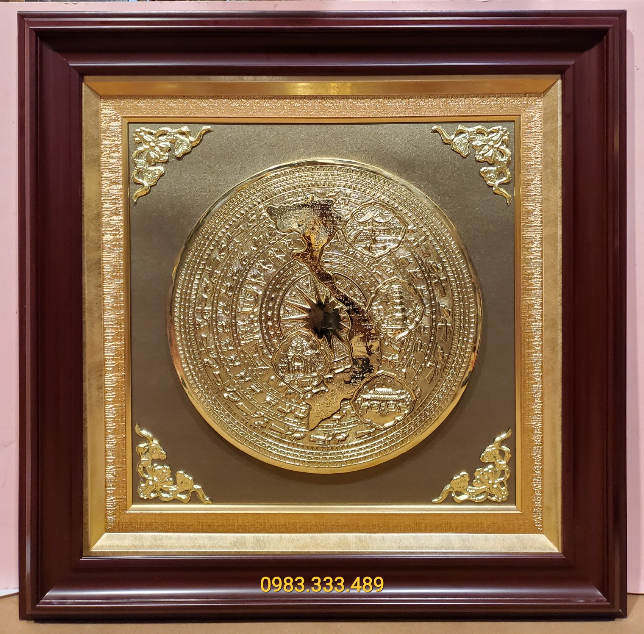 - – Chất liệu đồng vàng, được các tay thợ giỏi làng nghề gò thủ công rất tinh xảo, mặt trống hoa văn nổi chi tiết có hình bản đồ Việt Nam rất đầy đủ hình ảnh chùa 1 cột Hà Nội, chùa Thiên Mụ Huế,tháp Chàm Mỹ Sơn, bến cảng Nhà Rồng TP.HCM.